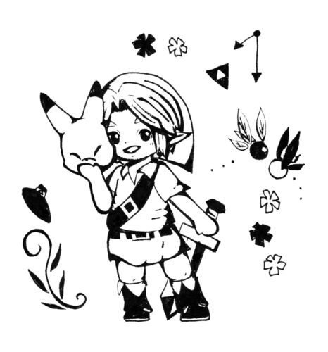 白黒でこどもリンク ゼルダ無双バージョンで描こうと思ったら、 鬼神の仮面を描き忘れた上に チャットとトレイルを加えてしまったの巻。 マイマイマイ、マイマイマイ。 神トラ2のイラストを描こうと思い、 三匹のマイマイと歌うリンクとゼルダ姫と いう組み…
