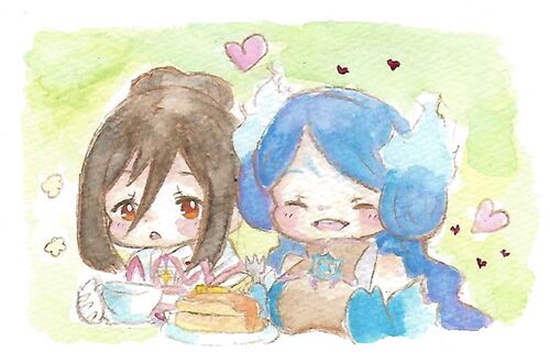 パンケーキを見てはしゃぐカグツチと紅茶を頂いている式典用礼装のメレフさんを描きました。